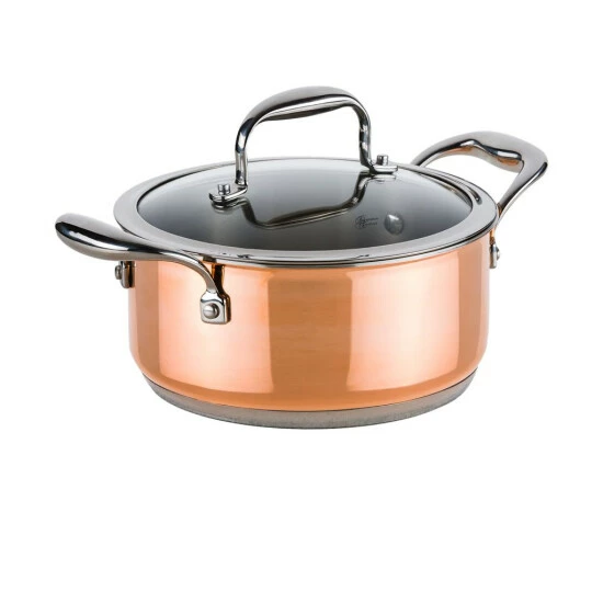 Mit Copperfit Emotion kochen Sie mit einem exklusiven Kochgeschirr in absoluter . Kupfer hat hervorragende Wärmeleiteigenschaften, die die Hitze gleichmäßig verteilen – für energiesparendes Kochen! Das hochwertige 3-Schicht-Material, bestehend aus edlem Kupfer, Aluminium und robustem Edelstahl, macht das Topf-Set zu einem massiven Kochgeschirr. Außerdem ist das Set besonders pflegeleicht und einfach zu reinigen. Ein breiter, umlaufender Schüttrand sorgt für eine saubere Arbeitsweise in Ihrer Küche und erleichtert das Abgießen. Die praktische Mess-Skala an der Topfinnenseite vereinfacht das Beigeben von Flüssigkeiten. Der stoßfeste Glasdeckel aus hitzebeständigem Güteglas ist ideal zum komfortablen Sichtkochen geeignet. Das traditionelle Design mit genieteten Griffen macht das Set zu einem ausgefallenen Kochgeschirr und das Kochen zu einer ganz besonderen Freude. Copperfit Emotion eignet sich bestens für alle Herdarten: Ceran, Halogen, Elektro, Gas, Induktion!