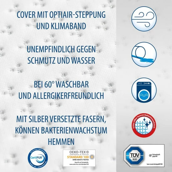- Highlight: Mit Silber versetzte Fasern im Toppercover sorgen dafür, dass das Bakterienwachstum gehemmt wird
