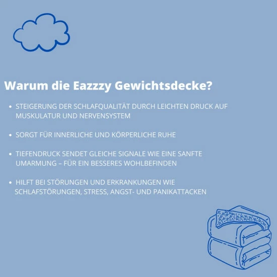 Die eazzzy Gewichtsdecke lässt sich ideal mit der eazzzy Kuscheldecke als Deckenüberzug kombinieren. In Kombination mit der Kuscheldecke, ist die Decke noch weicher und anschmiegsamer.