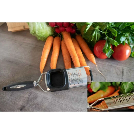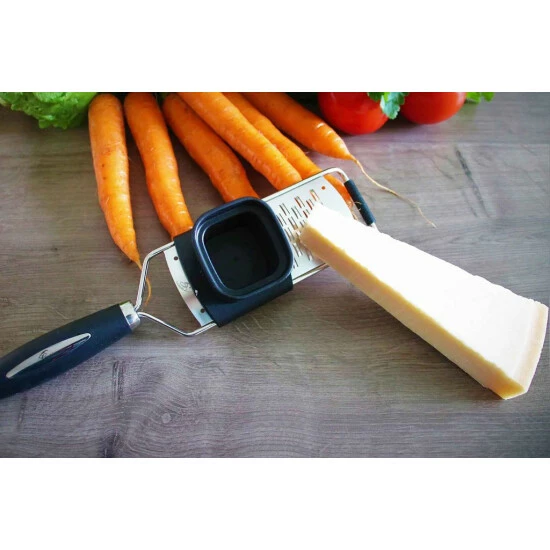 Ob Käse, Obst, Gemüse, Schokolade oder Butter, über die große, extrem scharfe Reibefläche lässt sich alles schnell und einfach reiben.