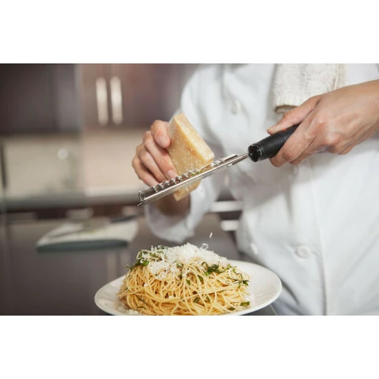 Der rutschhemmende und ergonomisch geformte Griff der Küchenreibe liegt angenehm in Ihrer Hand. Benützen Sie die Reibe direkt am Tisch um zum Beispiel Käse über Ihre Speisen genau nach Wunsch zu raspeln.