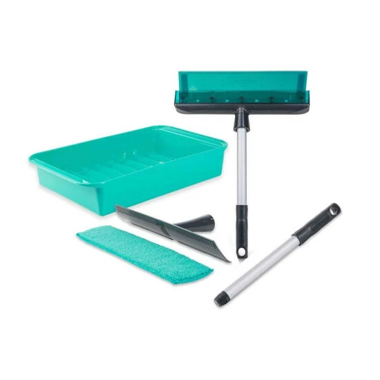 Dieses Set beinhaltet: 1 x Großer Fensterwischer 2 x Universalstange 1 x Vorwischer 1 x Mikrofaserbezug 1 x Wanne