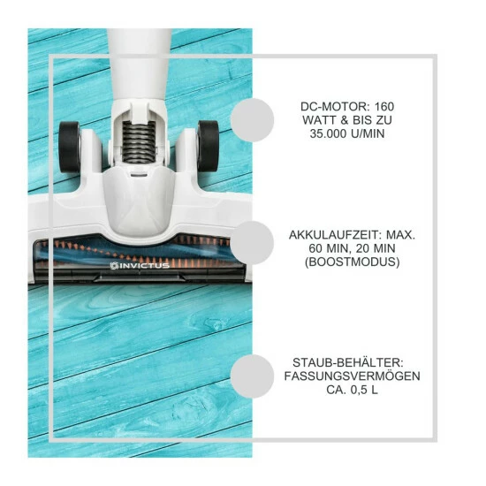 Der INVICTUS M5 ist einfach einer für ALLES! Mit bester Saugkraft, vielseitiger 3 in 1-Funktion, 60 Minuten Laufzeit und ohne Kabel können Sie alle Böden sowie jegliche Innen- und Außenbereiche gründlich reinigen und absoluten Komfort genießen.