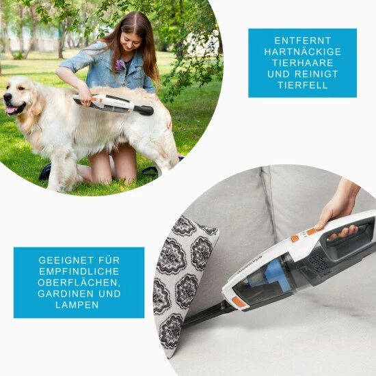 Das praktische Handgerät mit aufsteckbarem Zubehör ermöglicht Staubsaugen ohne Grenzen! Reinigen Sie Gardinen, Möbel, Autos oder schwer erreichbare Stellen, Hunde- und Katzenfell und entfernen Sie Tierhaare von Polstern. Selbst Krümel vom Tisch und Spinnenweben von der Decke lassen sich schnell beseitigen. Erleben Sie Sauberkeit zum Wohlfühlen – überall.