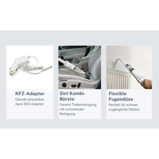 - Reinigung empfindlicher Oberflächen, sowie Polster und Möbel dank der 2in1 Kombi-Bürste