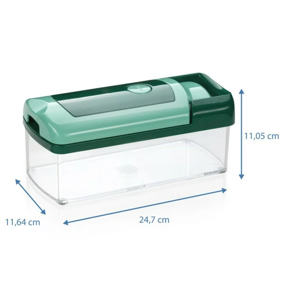 - Höchster Bedienkomfort: Es lassen sich große Mengen in Sekundenschnelle schneiden und direkt in den praktischen Auffangbehälter schneiden und darin aufbewahren. Dank der ergonomischen Kurbel ist das Bedienen besonders komfortabel.
