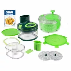 Dank des Nicer Dicer Pegasus geht die benötigte Schneidarbeit ganz leicht von der Hand. Mit der Salatschleuder im 16-teiligen Deluxe-Set sind die Salatblätter zudem nach dem Waschen ganz schnell getrocknet. Mit Hilfe der Salatschleuder von Genius können Sie in einer einzigen Schüssel Ihren Salat putzen, trocknen und anrichten.