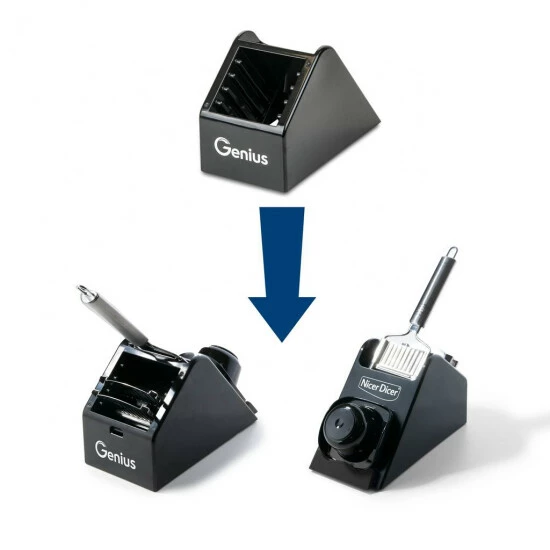 Die Box im modernen schwarz passt auf jede Arbeitsfläche und verstaut problemlos Ihr Nicer Dicer Speed Handgerät sowie nahezu alle Zubehörteile – sicher und platzsparend!