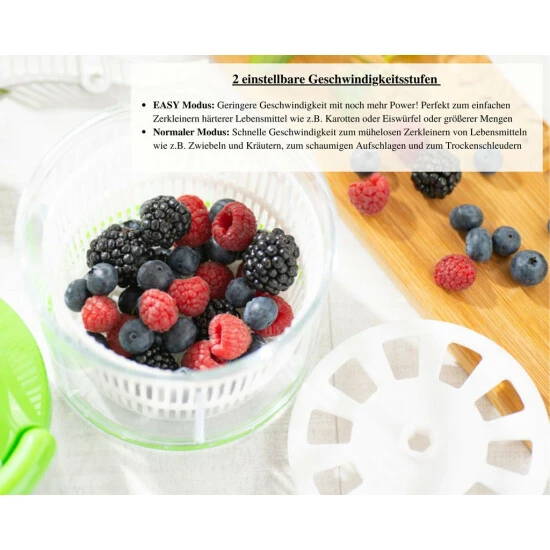 Absolute Besonderheit und einzigartig: Die 2 einstellbaren Geschwindigkeitsstufen ermöglichen besondere Flexibilität – auch extrem harte Lebensmittel wie Eiswürfel und Karotten werden dank des EASY Modus kinderleicht zerkleinert. Mit dem normalen Modus zerkleinern Sie Lebensmittel wie z.B. Zwiebeln, Kräuter etc. im Handumdrehen und ohne Mühe in Sekundenschnelle.