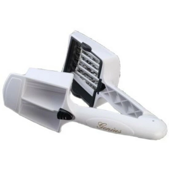Durch das kinderleichte Austauschen des Klingeneinsatzes können Sie nun mit einem einzigen Gerät wahlweise dicke oder dünne Scheiben schneiden. Ist der Schutzrahmen in den Scheiben-Schneider eingesetzt, schneidet das Gerät mit 6 Edelstahlklingen gleichmäßige Scheiben von ca. 1 cm Dicke. Nach Austausch des Schutzrahmens durch den Messereinsatz (mit zusätzlichen 5 Klingen) schneiden insgesamt 11 Edelstahlklingen mit Wellenschliff gleichmäßige, ca. 0,5 cm dünne Scheiben. Mit dem Scheiben-Schneider lassen sich viele Lebensmittel kinderleicht direkt über der Schüssel, dem Kochtopf oder Pfanne oder dem Teller zu gleichmäßigen Scheiben verarbeiten.