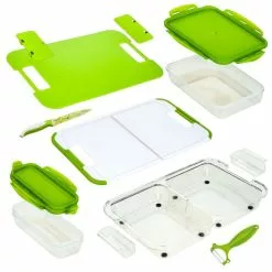Die Slice N Store-Behälter in unterschiedlichen Größen können zusätzlich in die Auffangschalen des Basisbehälters eingesetzt werden. Auf diese Weise können noch mehr unterschiedliche Lebensmittel verarbeitet und sauber getrennt werden. Natürlich können die einzelnen Behälter auch zum Servieren von Knabbereien oder Snacks verwendet werden.