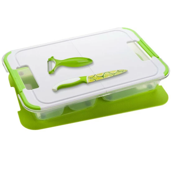 In Kombination mit dem Basisbehälter: Auf einer Seite schneiden und die geschnittenen Zutaten direkt in die daneben liegenden Behälter schieben – fertig, oder als Frühstücksbrettchen.