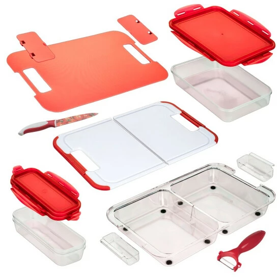 In Kombination mit dem Basisbehälter: Auf einer Seite schneiden und die geschnittenen Zutaten direkt in die daneben liegenden Behälter schieben – fertig, oder als Frühstücksbrettchen.